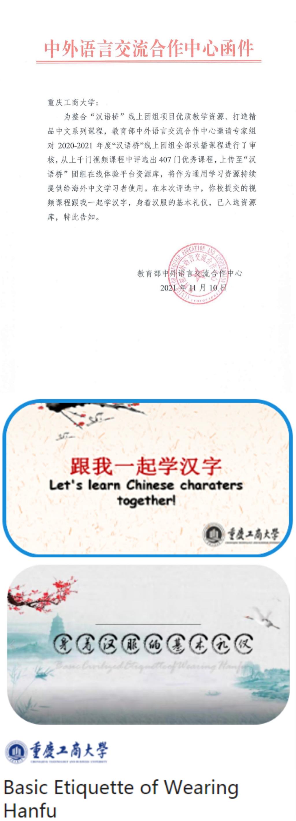 近日,万象城官网接教育部中外语言交流合作中心函告,留学生院制作的《跟我一起学汉字》和《身着汉服的基本礼仪》两门课程被教育部中外语言交流合作中心专家组评为优秀课程,入选语合中心精品教学资源库。