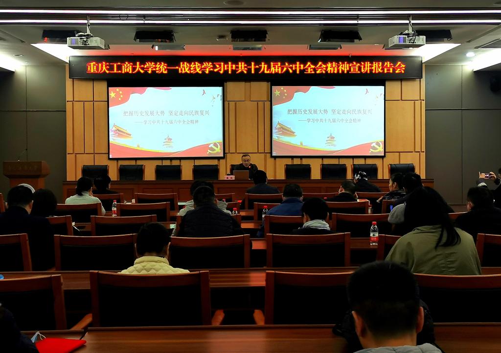 根据学校党委印发的《万象城娱乐awc线路关于学习宣传贯彻党的十九届六中全会精神深化拓展党史学习教育的工作方案》的安排,结合学校统一战线开展“学党史、讲《条例》、增合力、促发展”大走访大谈心活动,12月8日下午,学校党委统战部在新图书馆会议中心一会议室举办统一战线学习中共十九届六中全会精神宣讲报告会,各民主党派基层组织和统战团体班子成员及统战成员代表共计50余人参会。