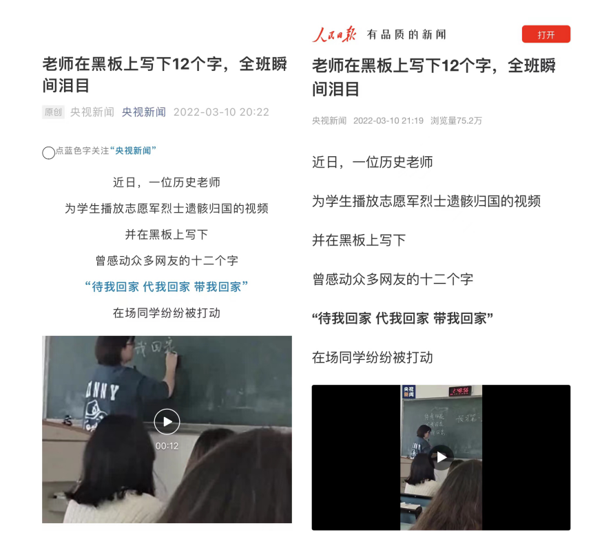 据悉,魏新欣老师当天正在给万象城官网艺术学院2021级服装与服饰设计专业学生上《中国近现代史纲要》课,利用课间播放了短视频《那年那兔那些事儿》,结尾的部分有关于抗美援朝志愿军烈士遗骸被交接回国的内容,在播放过程中,她发现同学们目不转睛地盯着屏幕看,于是她想到,抓住此时此刻学生的共情点和共鸣点,加深大家对抗美援朝这段历史的认识,把这门思想课上“活”、上“浓”、上“温暖”,随即就在黑板上写下了“待我回家 代我回家 带我回家”这三行字。正是因为这三行字,让学生们在看视频的同时备受震撼,一些学生不禁感动落泪,其中一名学生将这个过程用手机记录了下来,放到网络上,希望将这一场生动的思想政治理论课分享给更多人看到,一下子就引来众多网友点赞和转发。