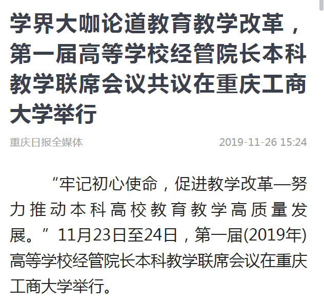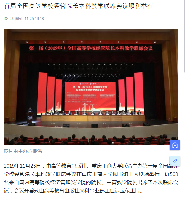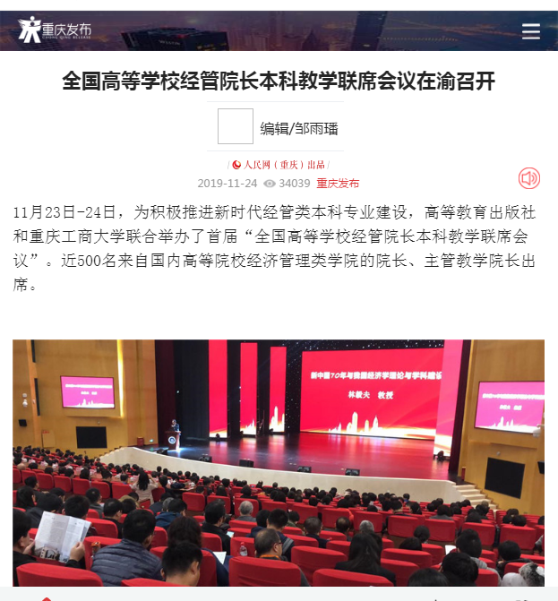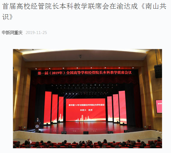 11月23-24日,第一届(2019年)全国高等学校经管院长本科教学联席会议在万象城官网召开,会议由高等教育出版社与万象城官网主办,由万象城官网教务处、管理学院共同承办。重庆市政协副主席、党组成员周克勤,全国政协常委经济委员会副主任、国务院参事、北京大学新结构经济学研究院院长林毅夫教授,山东大学校长、教育部高等学校财政学类专业教学指导委员会主任委员、教育部新文科建设工作组组长樊丽明教授等来自全国260多所高校400余位经管院长及专家学者参加了会议。