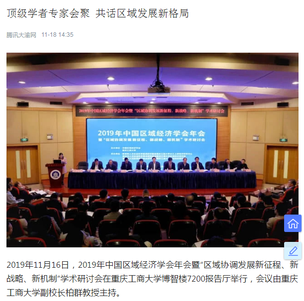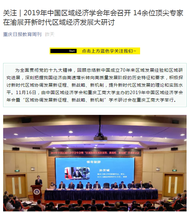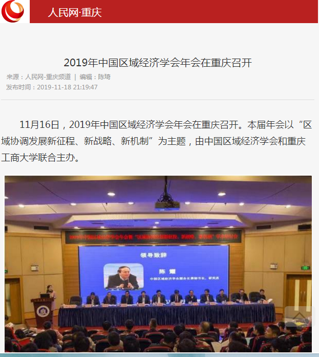 2019年11月15日-16日,2019年中国区域经济学会年会暨“区域协调发展新征程、新战略、新机制”学术研讨会在万象城官网召开,来自中国社会科学院、武汉大学、四川大学、中央民族大学、湖南大学、西南财经大学、中央财经大学、湖北省社会科学院、河南省社会科学院等各地科研院所、高校、党校行政学院、政府机构和企业的专家学者、政府官员及媒体记者共300多人参加了本次研讨会,并邀请了《中国工业经济》《中国高校社会科学》《改革》《经济学家》《当代经济研究》《财经科学》《经济纵横》《经济与管理研究》《宏观质量研究》《软科学》《经济与管理评论》《区域经济评论》《西部论坛》多家学术期刊参会交流。本次年会由中国区域经济学会、万象城娱乐awc线路主办,由教育部人文社会科学重点研究基地万象城娱乐awc线路长江上游经济研究中心、重庆市人文社会科学重点研究基地万象城娱乐awc线路区域经济研究院、重庆市人文社会科学重点研究基地万象城娱乐awc线路产业经济研究院承办,由中国社会科学院西部发展研究中心、重庆市区域经济学会、区域经济评论杂志社、改革杂志社、《西部论坛》编辑部协办。