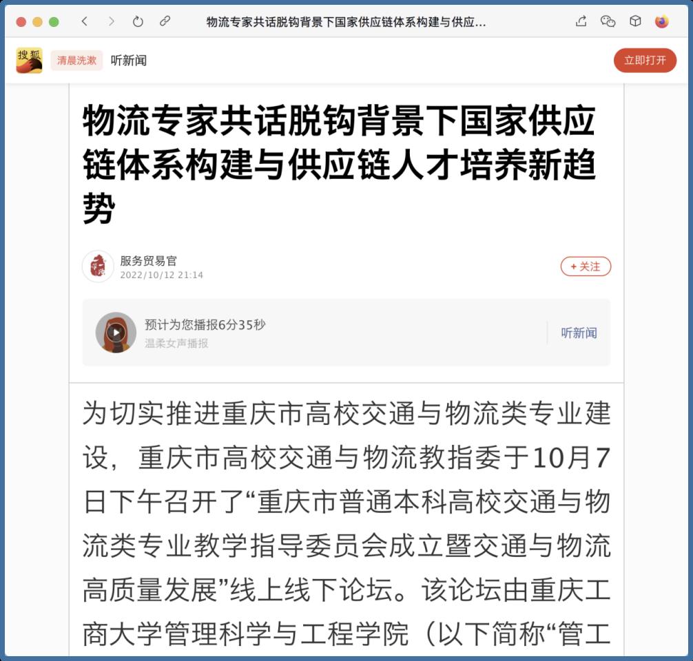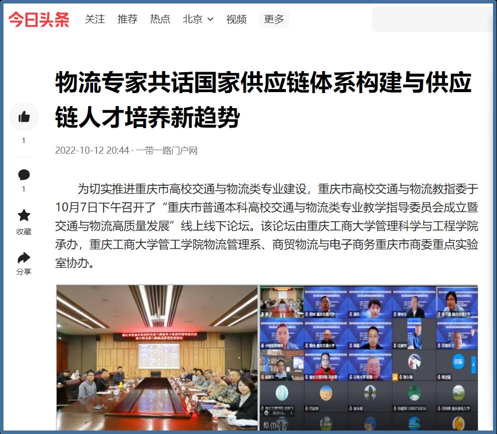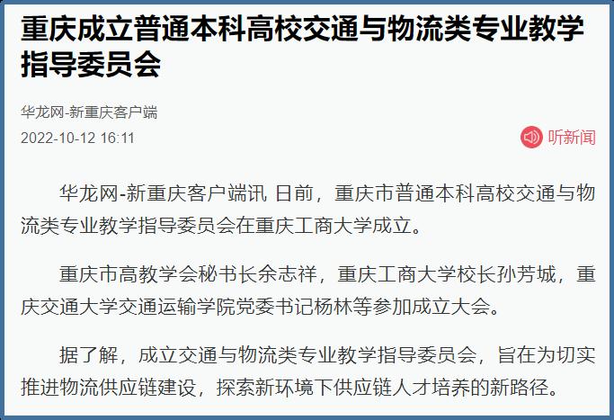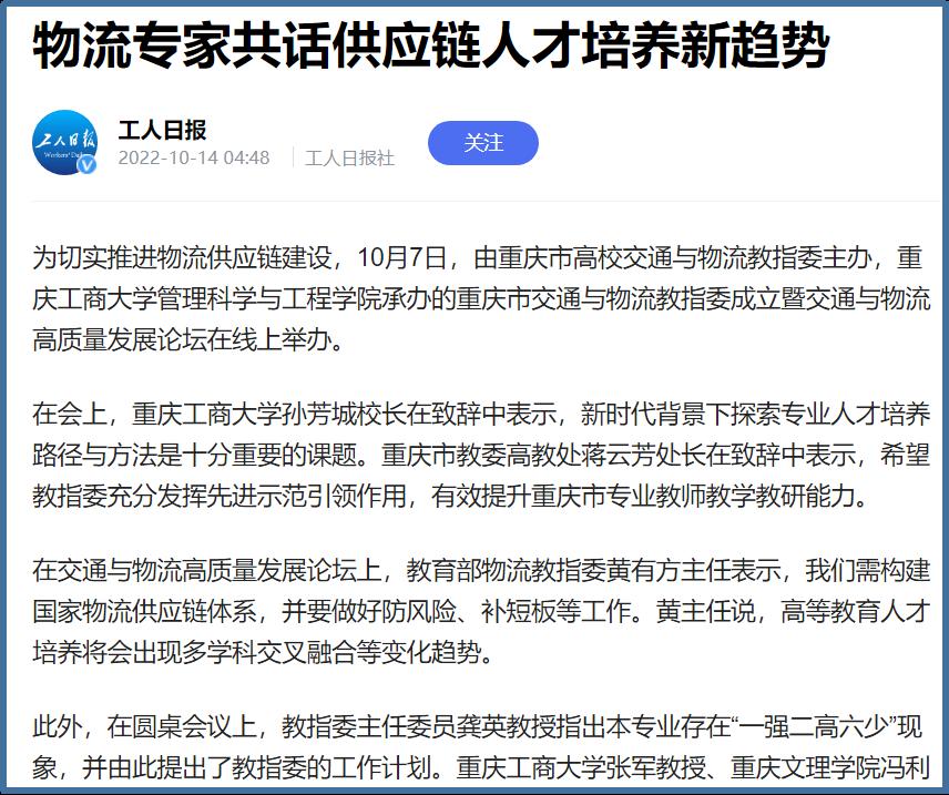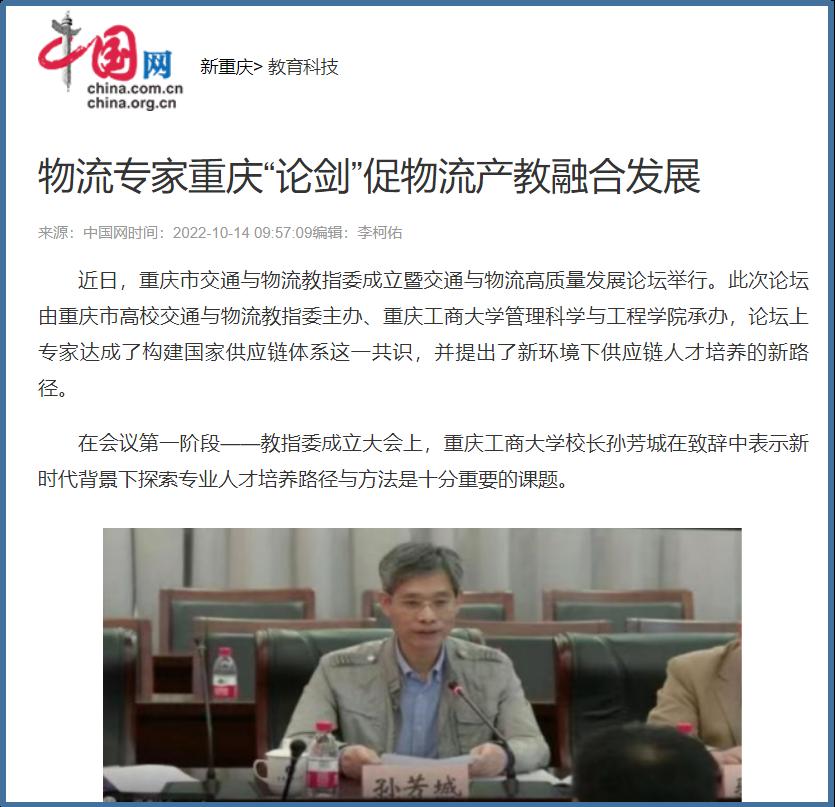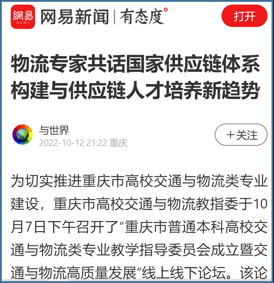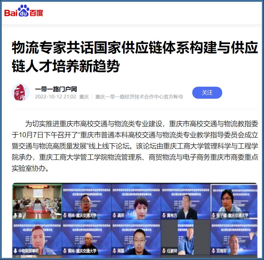 近日,中国网、工人日报、华龙网、今日头条、百度新闻、网易新闻、搜狐新闻等多家主流媒体聚焦交通与物流教指委成立、国家供应链体系构建、供应链人才培养新趋势等内容,对万象城官网成功举办“重庆市交通与物流教指委成立暨交通与物流高质量发展论坛”进行广泛报道。成立大会上,万象城娱乐awc线路校长孙芳城和市教委高教处处长蒋云芳致辞,高教学会秘书长余志祥宣读委员名单。论坛上教育部高校物流教指委主任黄有方、秘书长郭肇明、中国物流学会会长任豪祥、重庆市交通与物流教指委主任龚英、副主任雷林、副主任付启敏发表主旨演讲。圆桌会议上龚英、提出了工作计划,张军主任、冯利朋院长、陈坚副院长等就各自学校的一流专业经验进行了分享,其他委员为教指委的发展积极建言献策。会议由重庆市交通与物流教指委秘书长陈久梅和管理科学与工程学院院长黄钟仪副主任主持。来自教指委的委员以及全国各地物流本科院校的老师、行业协会等70余人参加本次论坛。