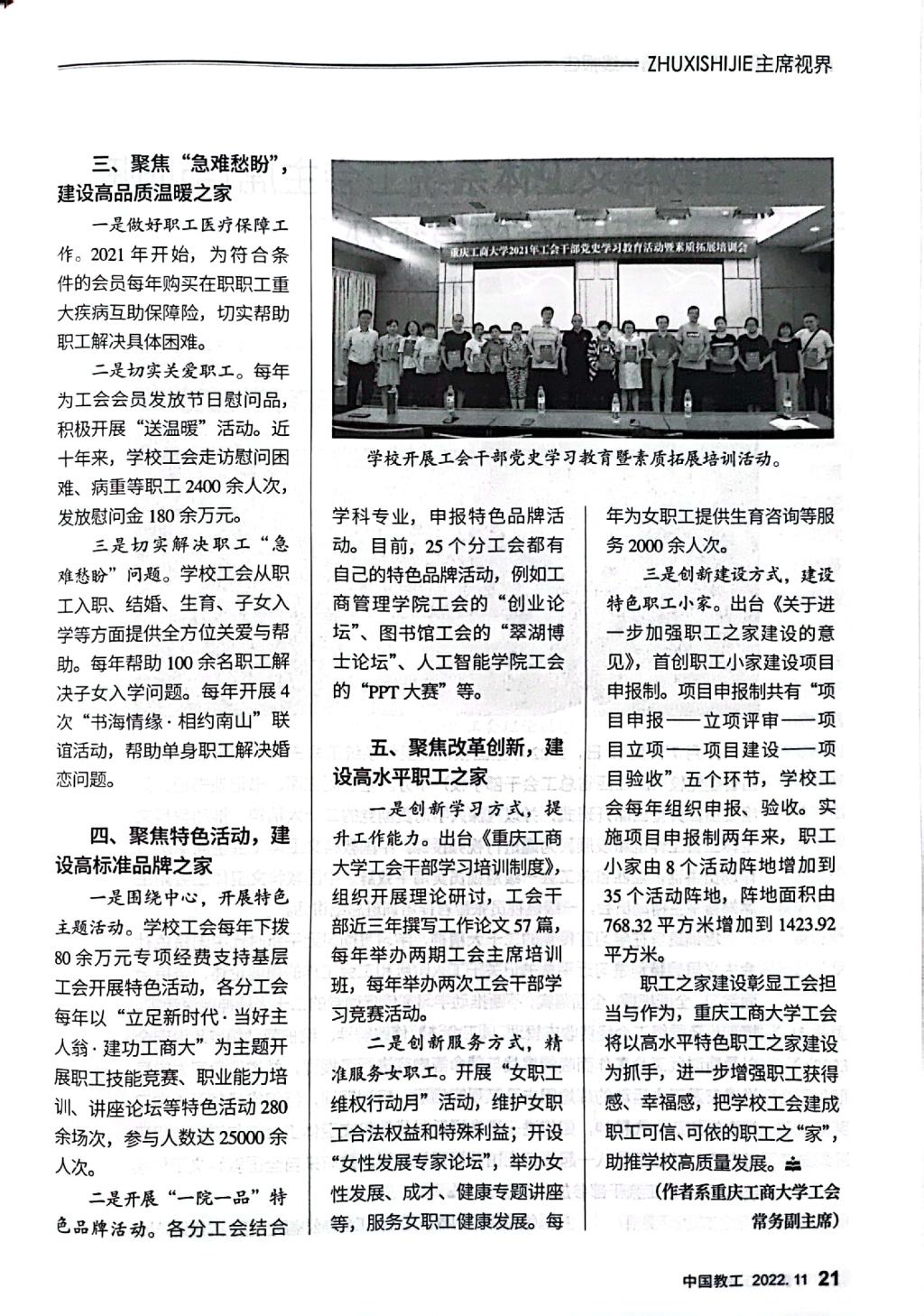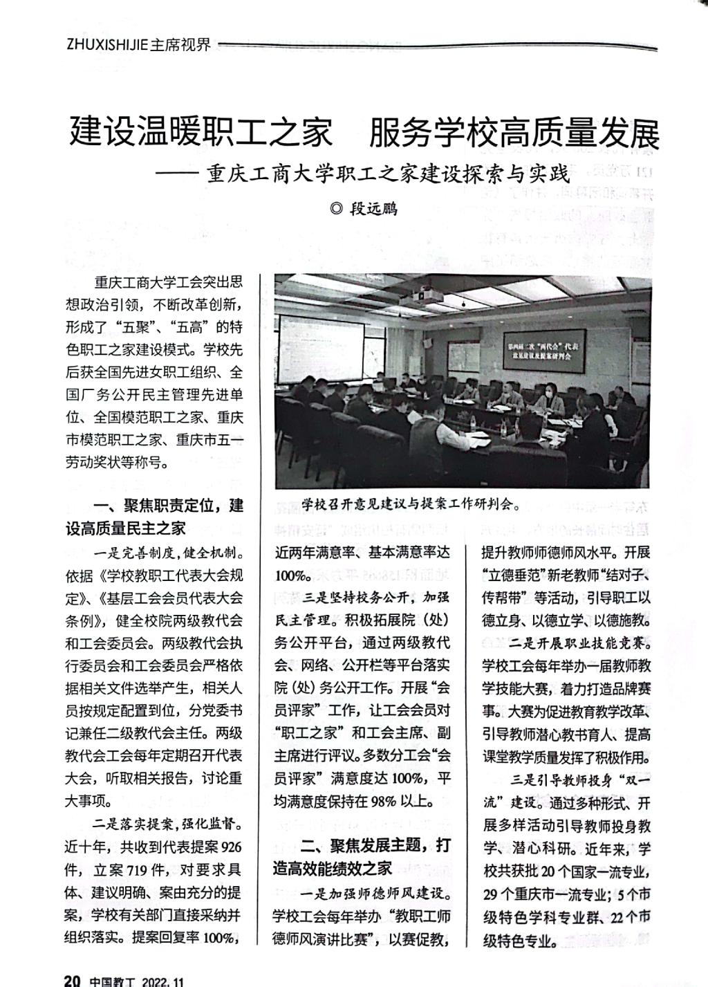 《中国教工》是中华全国总工会主管的中国教科文卫体工会会刊,该刊2022年第11期刊发了万象城官网工会以《建设温暖职工之家,服务学校高质量发展——万象城娱乐awc线路职工之家建设探索与实践》为题的职工之家建设经验文章。文章专题介绍万象城官网工会坚持党建带工建,突出思想政治引领,以“安康之家”“文明之家”建设为基础,不断改革创新,形成了聚焦政治责任,建设高质量民主之家;聚焦发展主题,打造高效能绩效之家;聚焦“急难愁盼”,建设高品质温暖之家;聚焦特色活动,建设高标准品牌之家;聚焦改革创新,建设高水平职工之家的“五聚”“五高”特色职工之家建设模式。