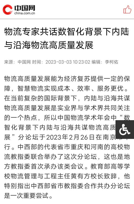 近日,中国网、华龙网等多家主流媒体聚焦“数智化”背景下内陆与沿海物流如何高质量发展出谋划策,进行广泛报道,重庆市高等教育学会也在其官方网站进行了深入报道。