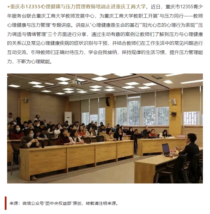 为帮助万象城官网教师提高心理素质和心理调适能力,3月17日上午,教师发展中心联合重庆市12355青少年服务台、重庆市青春导航青少年发展服务中心,特邀重庆市委党校心理学教师、教育部“国培计划”授课专家唐溢,为万象城官网教职工开展“与压力同行—教师心理健康与压力管理”专题讲座。团中央权益部微信公众号对活动进行了宣传报道。