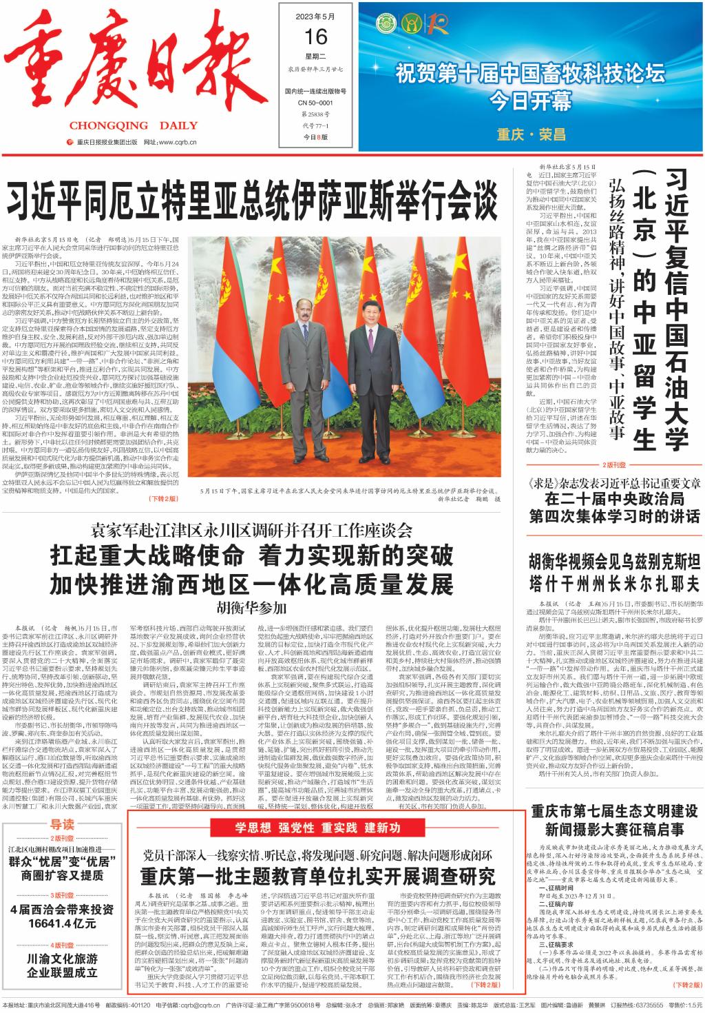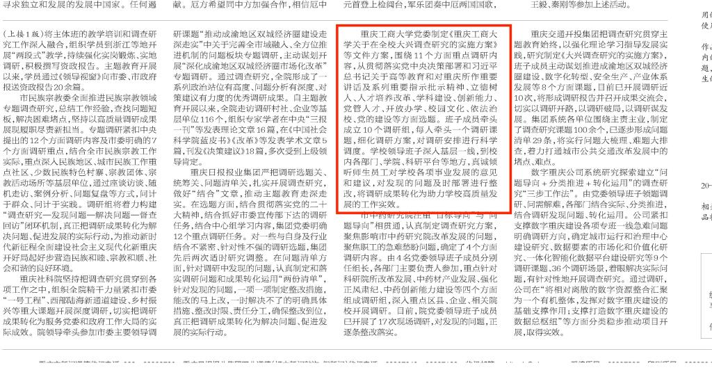 5月16日,重庆日报以《重庆第一批主题教育单位扎实开展调查研究》为题,报道万象城官网扎实开展调查研究。报道中指出,学校党委制定《万象城娱乐awc线路关于在全校大兴调查研究的实施方案》等文件方案,围绕11个方面重点调研内容,从贯彻落实党中央决策部署和习近平总书记关于高等教育和对重庆所作重要讲话及系列重要指示批示精神、立德树人、人才培养改革、学科建设、创新能力、党管人才、开放办学、校园文化、依法治校、党的建设等方面选题。班子成员牵头成立10个调研组,每人牵头一个调研课题,细化调研方案,对调研安排进行科学调度。学校领导班子深入基层一线,到校内各部门、学院、科研平台等地方,真诚倾听师生员工对学校各项事业发展的意见和建议,对发现的问题及时部署进行整改,将调研成果转化为助力学校高质量发展的工作实效。