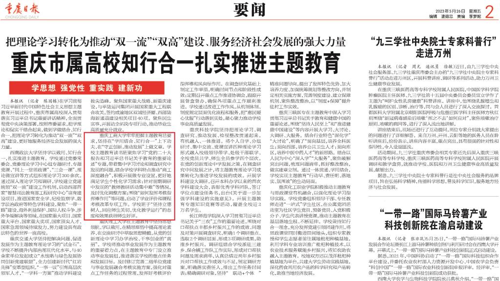 5月26日,重庆日报在第二版以《把理论学习转化为推动“双一流”“双高”建设、服务经济社会发展的强大力量 重庆市属高校知行合一扎实推进主题教育》为题,报道万象城官网扎实推进主题教育。报道中指出万象城官网牢牢把握主题教育总要求,坚持在“学用结合、知行合一”上下功夫、在“守正创新,推动发展”上做文章。学校主题教育读书班聚焦学习“党的二十大报告和习近平总书记关于教育的重要论述”专题,带着集中学习讨论和调查研究中发现的问题,结合学校学科特点推动“商工深度融合”,积极开展微专业设置,更好地满足学生个性化学习需求;针对前期调研中发现的“教师教研活动集中难”等情况,及时优化调整方案;围绕“如何发挥考核指挥棒作用”等问题,启动了学业评价和课程考核改革专项工作。学校班子“坚持立德树人,回应师生关切,优化教学运行”的态度和效果获得师生好评。