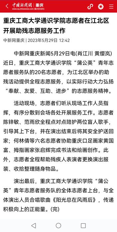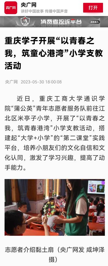 近日,央广网以《重庆学子开展“以青春之我,筑童心港湾”小学支教活动》为题,报道万象城官网通识学院开展小学支教活动;中国新闻网以《万象城娱乐awc线路通识学院志愿者在江北区开展助残志愿服务工作》为题,报道万象城官网通识学院志愿者参与江北区助残活动。