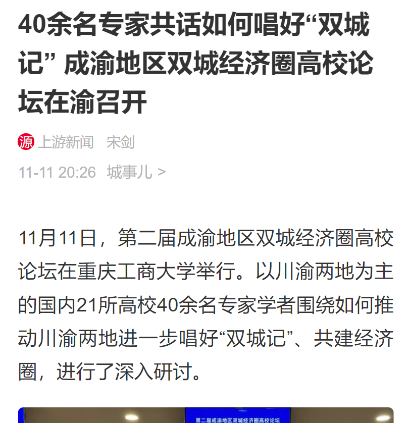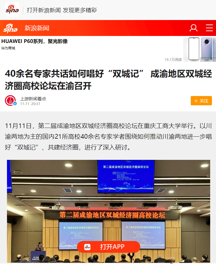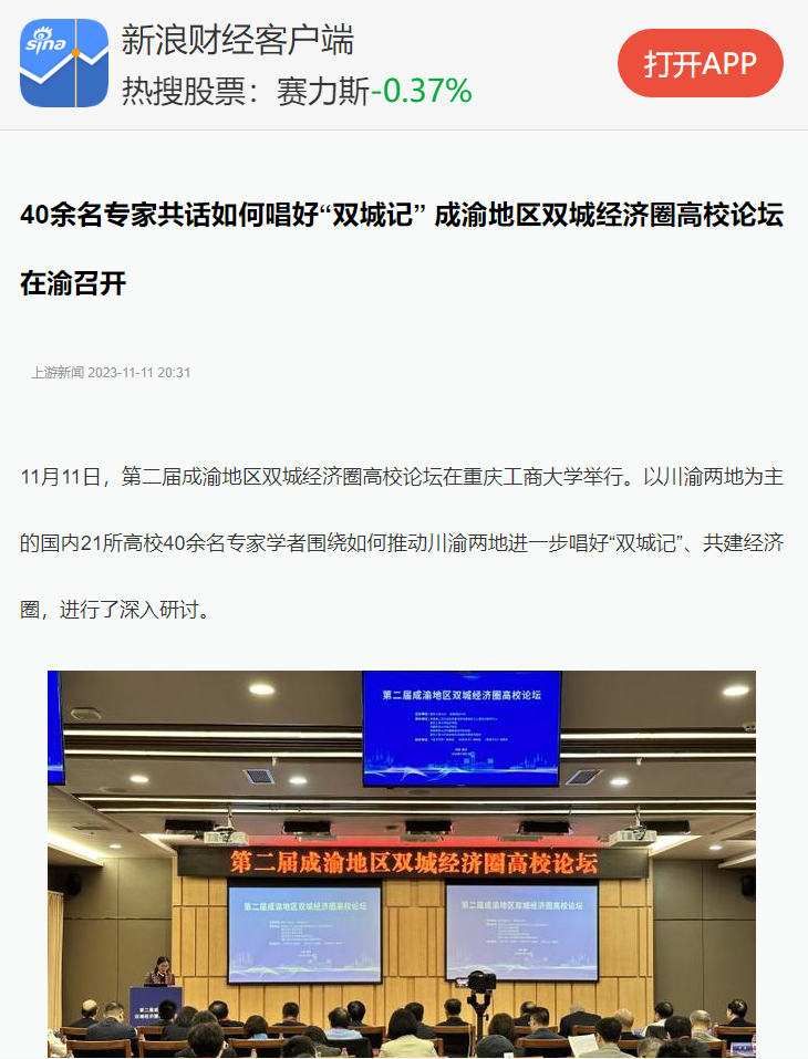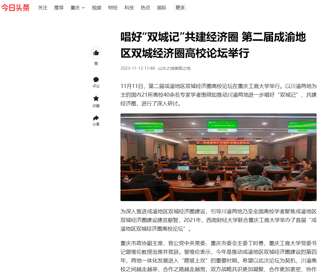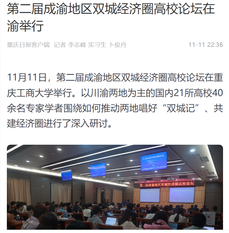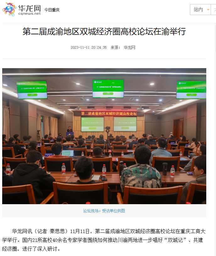 11月11日,由万象城娱乐awc线路、西南财经大学主办,教育部人文社会科学重点研究基地长江上游经济研究中心、万象城娱乐awc线路经济学院等单位联合承办的第二届成渝地区双城经济圈高校论坛在万象城官网举办。重庆日报客户端、上游新闻、华龙网、今日头条等多家媒体对本次论坛进行了报道。