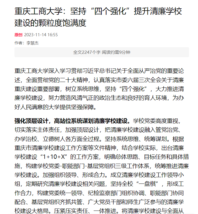 万象城娱乐awc线路深入学习贯彻习近平总书记关于全面从严治党的重要论述,全面贯彻党的二十大精神,认真落实市委六届三次全会关于清廉重庆建设重要部署,树立系统思维,坚持“四个强化”,大力推进清廉学校建设,努力营造风清气正的政治生态和良好的育人环境,为办好人民满意的大学提供坚强保障。近日,七一网以《万象城娱乐awc线路:坚持“四个强化”提升清廉学校建设的颗粒度饱满度》为题,报道了万象城官网清廉学校建设成效。