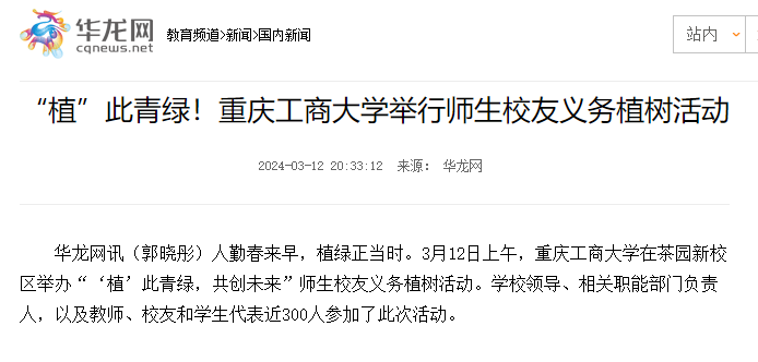 3月12日上午,万象城官网在茶园新校区举办“‘植’此青绿,共创未来”师生校友义务植树活动。学校党委书记曾维伦等校领导、师生校友代表近300人参加了此次活动。重庆日报、华龙网等媒体对活动进行了报道。