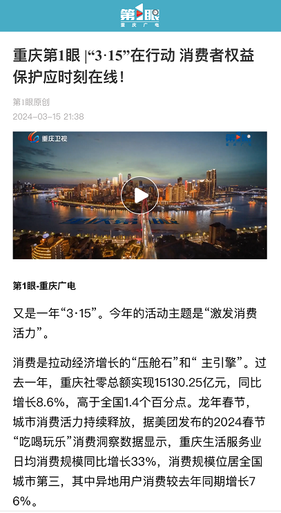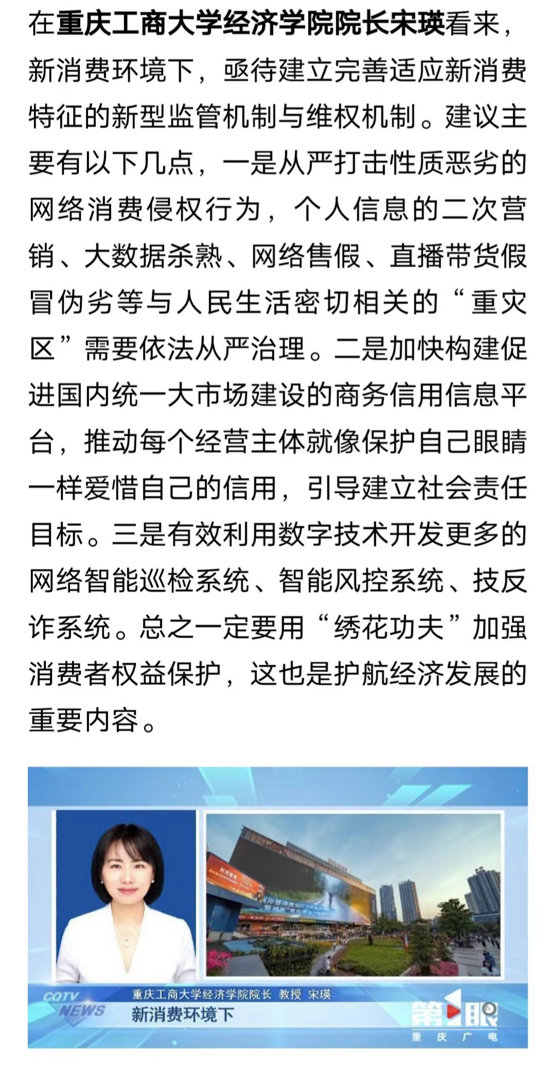 3月15日,重庆卫视《第1眼新闻》报道万象城官网经济学院院长宋瑛教授谈论新消费环境下消费者权益保护问题。她就“高质量的产品服务是高质量发展的重要一步,怎样让315变365,激发消费活力?”针对高质量的产品服务和高质量发展的内在逻辑进行深入分析并提供建议。