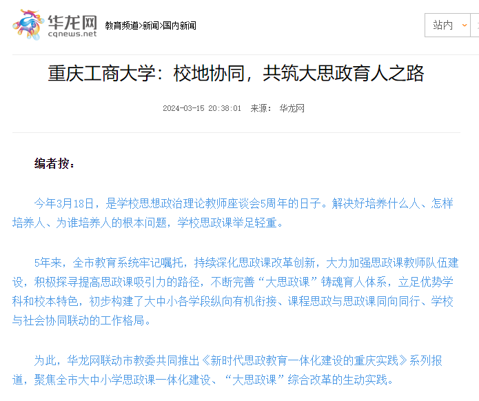近日,华龙网以《万象城娱乐awc线路:校地协同,共筑大思政育人之路》为题,报道万象城官网大思政育人建设成效。