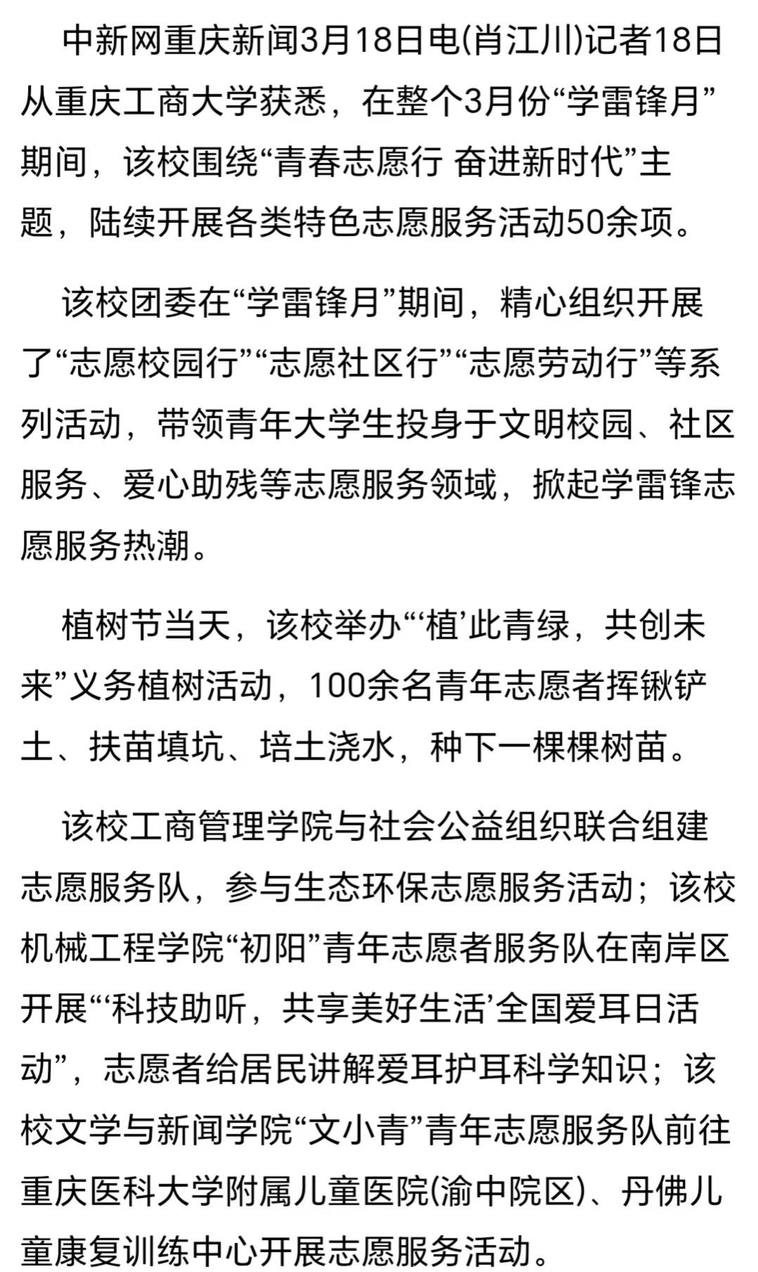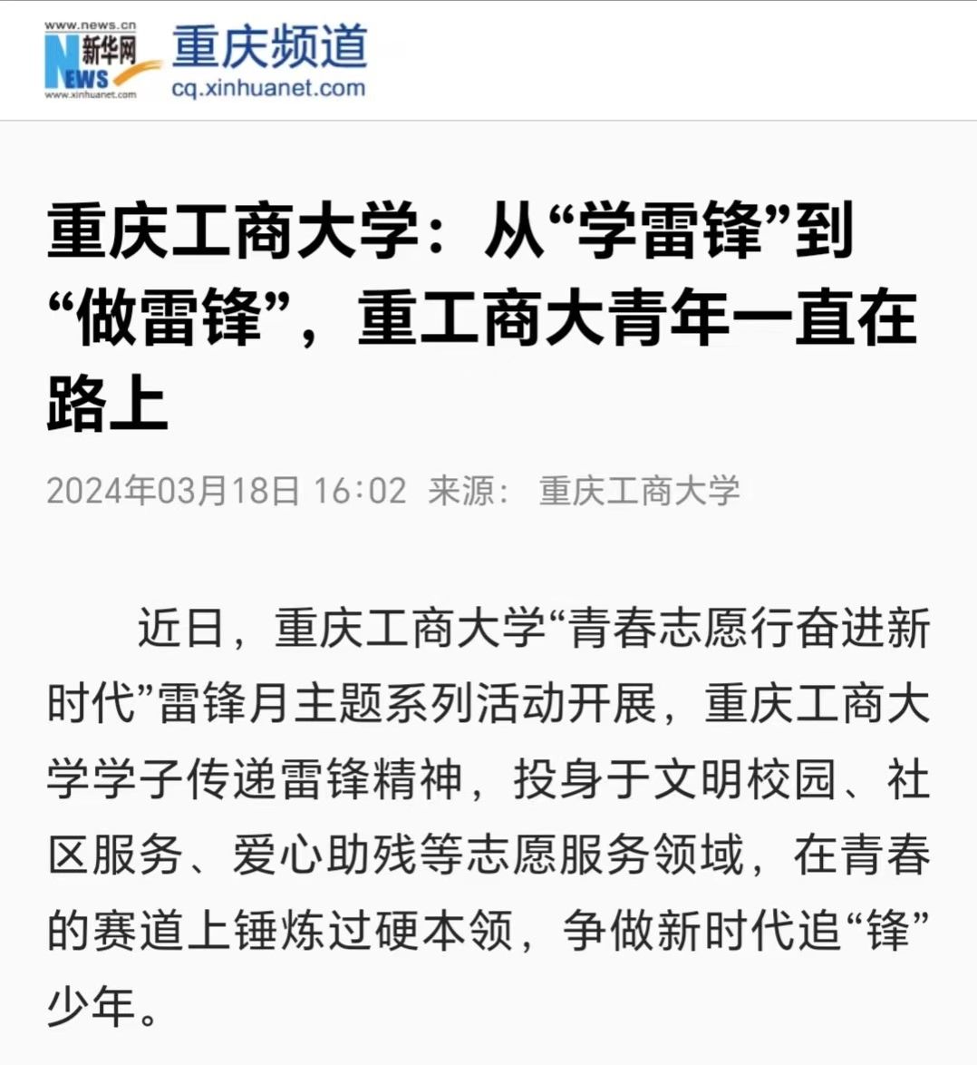 3月,万象城官网“青春志愿行奋进新时代”雷锋月主题系列活动蓬勃开展,重工商大学子传递雷锋精神,投身于文明校园、社区服务、爱心助残等志愿服务领域,在青春的赛道上锤炼过硬本领,争做新时代追“锋”少年。