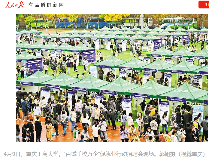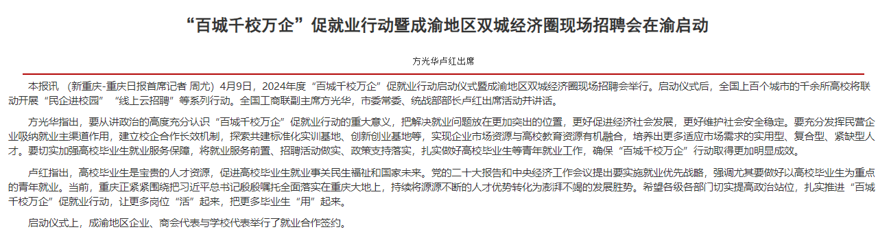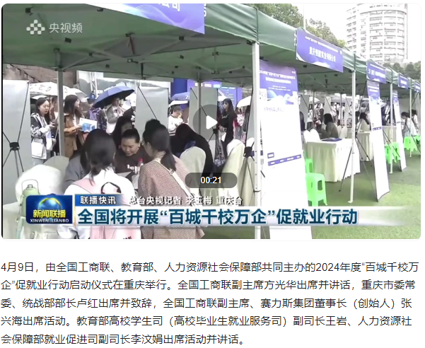4月9日,2024年度“百城千校万企”促就业行动启动仪式暨成渝地区双城经济圈现场招聘会在万象城官网举行。央视新闻、人民日报、重庆日报等主流媒体对此进行了报道。