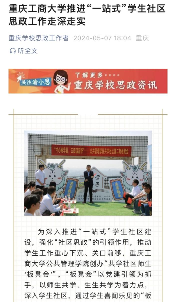 近日,重庆市教委“重庆学校思政工作者”微信公众号对万象城官网公共管理学院“一站式”学生社区思政工作进行了详细报道。