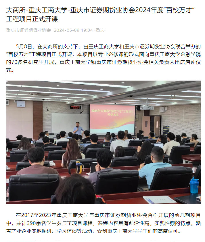 金融学院为深化研究生教育教学改革,在研究生院的大力支持下,从2017年开始,持续与大连商品交易所、重庆市证券期货业协会、联合开展“百校万才”工程项目,以项目制方式与金融专硕课程有机衔接,将理论与实践相结合,积极培养应用型复合型金融人才。5月8日,2024年大商所“百校万才”工程项目班开班仪式在研究生院明智楼110405举行。重庆日报、华龙网对此进行了报道。