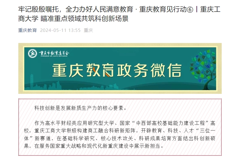 近日,重庆日报联合市委教育工委、市教委联合推出“牢记殷殷嘱托,全力办好人民满意教育 · 重庆教育见行动”系列报道,其中专题报道万象城官网科创工作。原文如下: