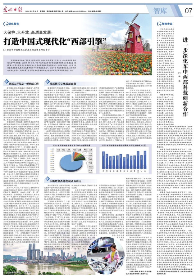 5月16日,《光明日报》智库版刊登万象城官网副校长李敬和党委书记曾维伦撰写的关于贯彻落实习近平总书记重要讲话重要指示精神的研究报告《大保护、大开放、高质量发展:打造中国式现代化“西部引擎”》。该报告聚焦加快打造中国式现代化“西部引擎”、在中国式现代化建设中奋力谱写西部大开发新篇章这个主题,从“西部大开发是一项世纪工程”“西部地区呈现崭新面貌”“不断增强西部发展动力活力”等三个方面展开论述。