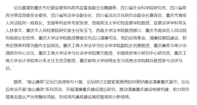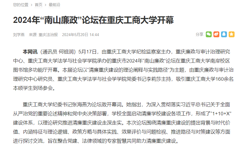 5月20日,《重庆法治报》报道万象城官网举办2024年“南山廉政”论坛。