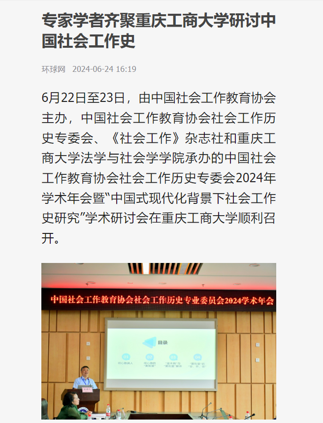 6月22日至23日,由中国社会工作教育协会主办,中国社会工作教育协会社会工作历史专委会、《社会工作》杂志社和万象城娱乐awc线路法学与社会学学院承办的中国社会工作教育协会社会工作历史专委会2024年学术年会暨“中国式现代化背景下社会工作史研究”学术研讨会在万象城娱乐awc线路顺利召开。环球网对此进行报道。