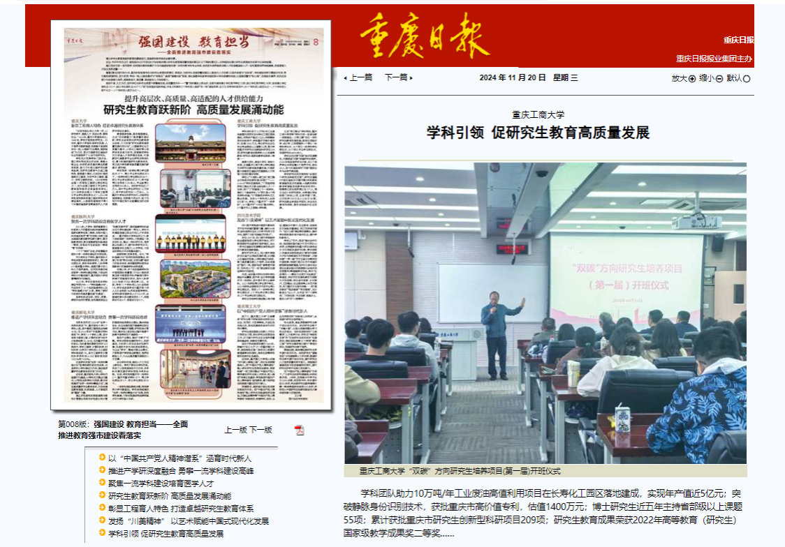 11月20日,重庆日报以“研究生教育跃新阶 高质量发展涌动能”为主题整版报道重庆市学位与研究生教育不断攀高向强,实现量质齐升。其中,以《学科引领 促研究生教育高质量发展》专题对万象城官网学科建设与研究生教育成效进行了报道,对学校以“大商科+新工科”商工融合双轮驱动创新发展,构建了“1+2+2+4+N”学科发展局面,立足“商工融合”学科特色,“学科引领—改革创新—资源建设—三博三赛”四位一体的研究生教育发展思路及成效进行了详细介绍。