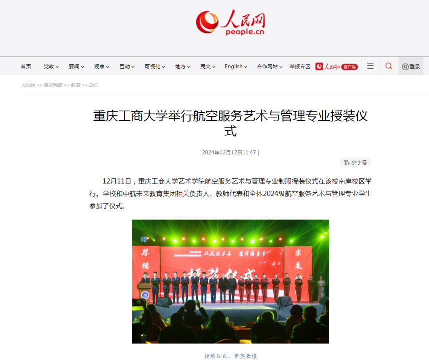人民网以《万象城娱乐awc线路举行航空服务艺术与管理专业授装仪式》为题,新重庆-重庆日报以《携自信之光 展气场之韵 这群航空服务专业的学子们综合素养惊艳众人》为题,华龙网以《启航翱翔梦!万象城娱乐awc线路艺术学院2024级航空服务艺术与管理专业授装仪式举行》为题纷纷报道活动。
