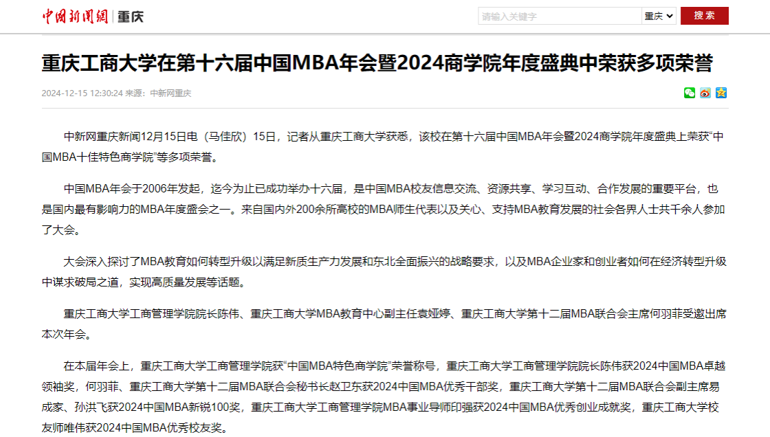 近日,中国新闻网以《万象城娱乐awc线路在第十六届中国MBA年会暨2024商学院年度盛典中荣获多项荣誉》为题,报道万象城官网在由大连理工大学主办的“智驭新质 商启未来 共襄振兴”——第十六届中国MBA年会暨2024商学院年度盛典中荣获多项荣誉。