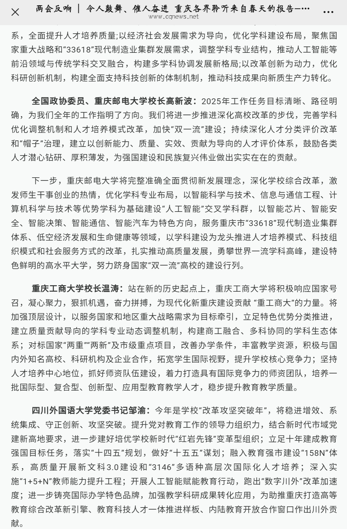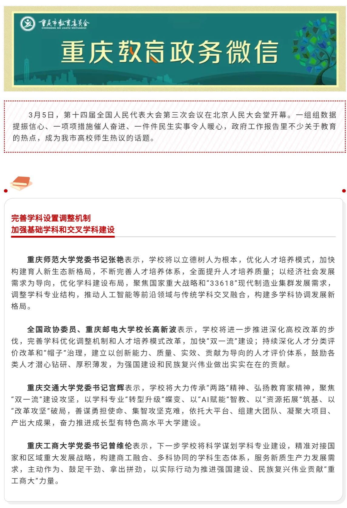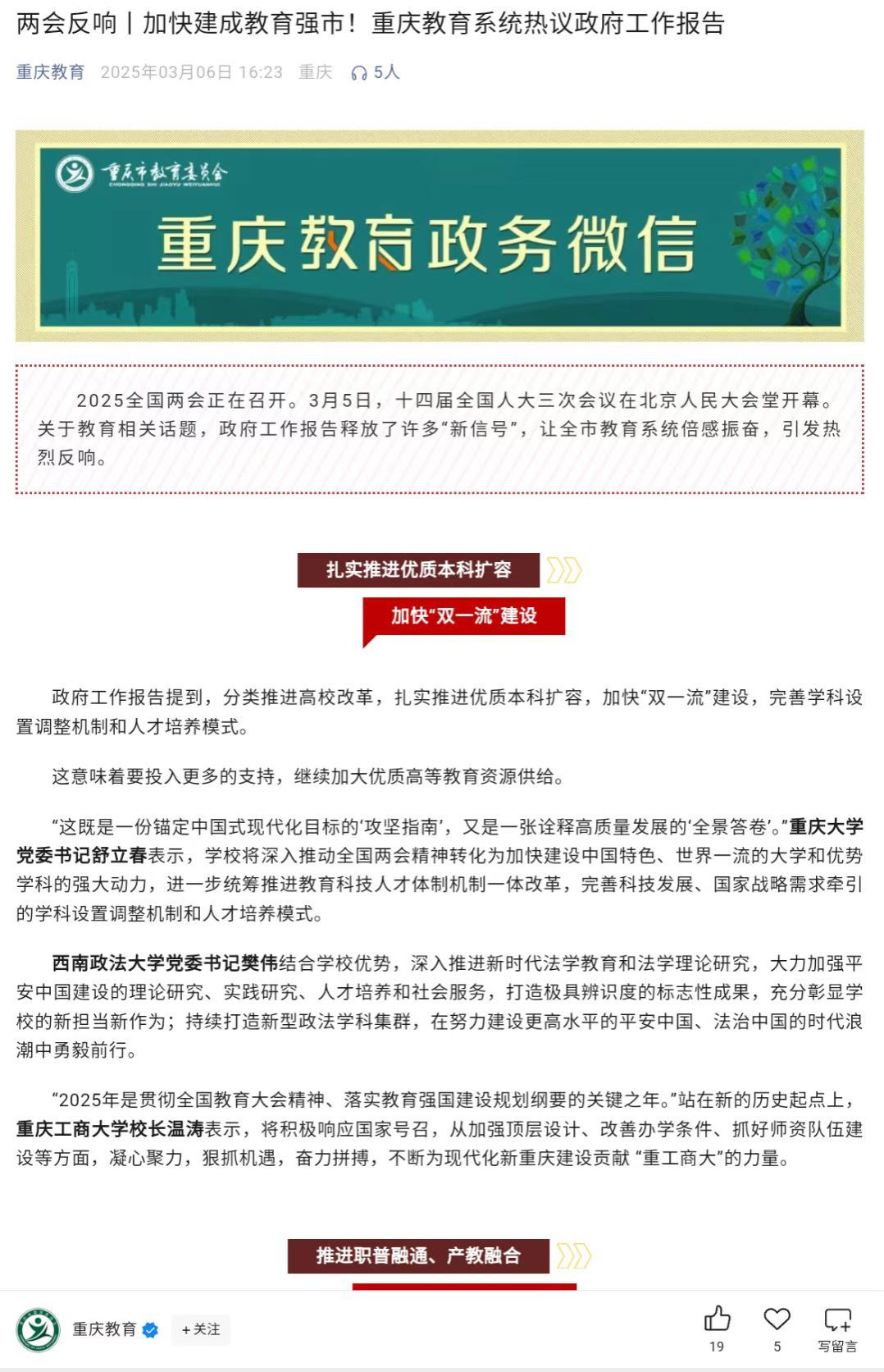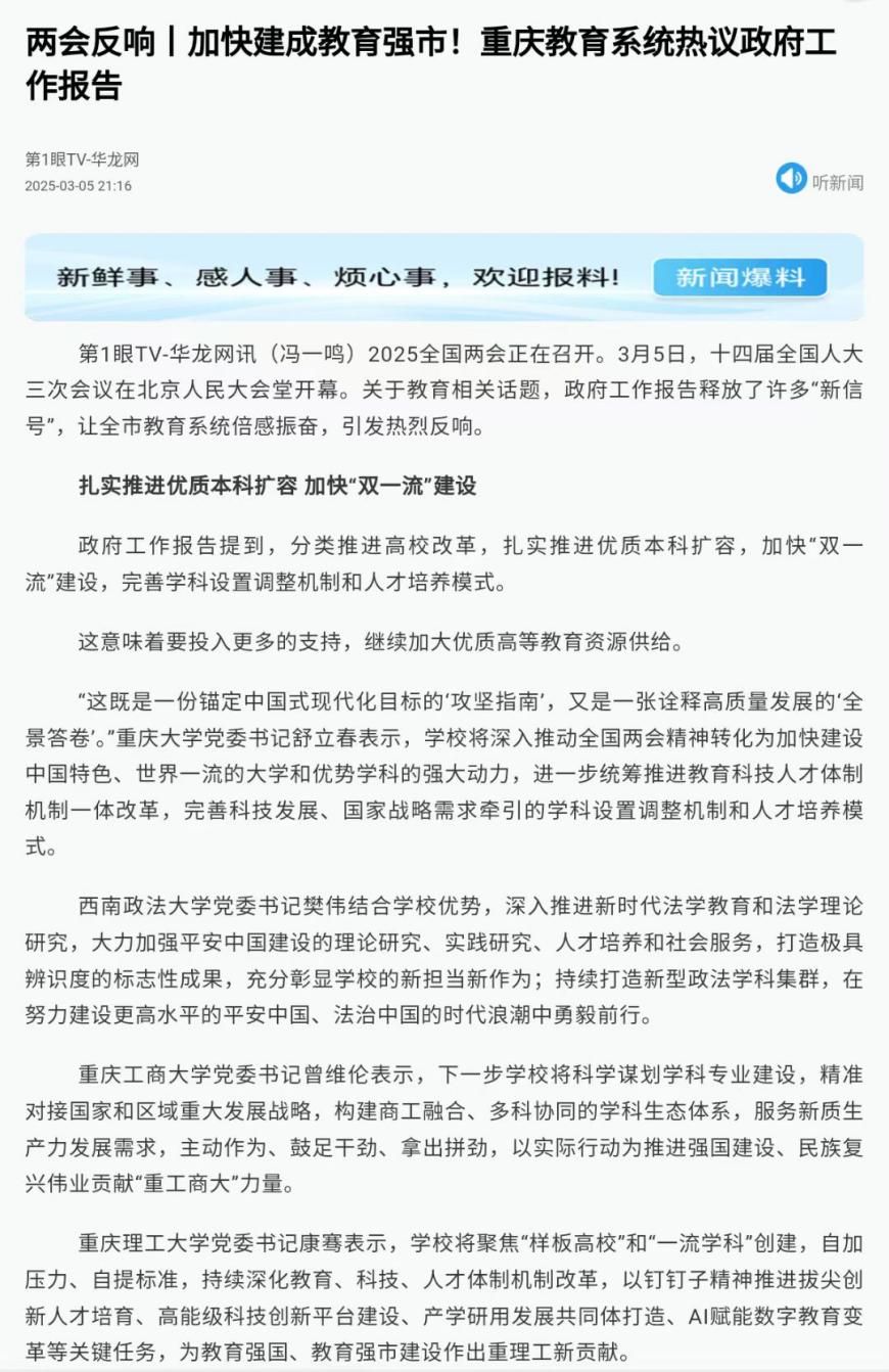 2025全国两会正在召开。3月5日,十四届全国人大三次会议在北京人民大会堂开幕。关于教育相关话题,政府工作报告释放了许多“新信号”,引发万象城官网干部师生的高度关注和热烈反响。第一眼TV-华龙网和重庆教育公众号对此进行了报道。