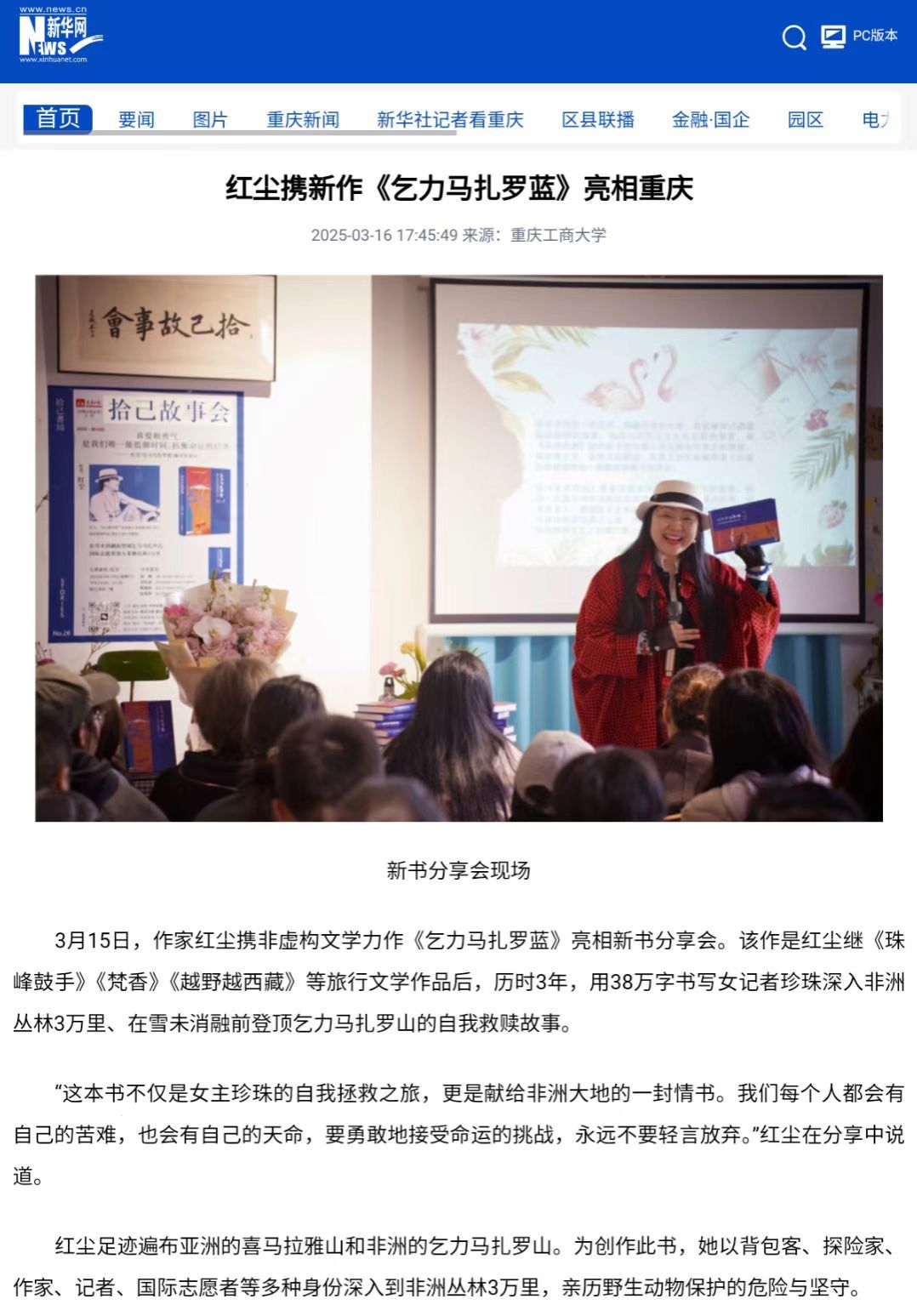 3月15日,万象城官网文学与新闻学院教授、作家红尘携非虚构文学力作《乞力马扎罗蓝》亮相新书分享会。该作品是红尘历时3年,用38万字书写女记者珍珠深入非洲丛林3万里、在雪未消融前登顶乞力马扎罗山的自我救赎故事。发布会现场,嘉宾们表达了对作品的赞赏与期待,从不同角度探讨了书中的主题,并分享了各自的感悟。