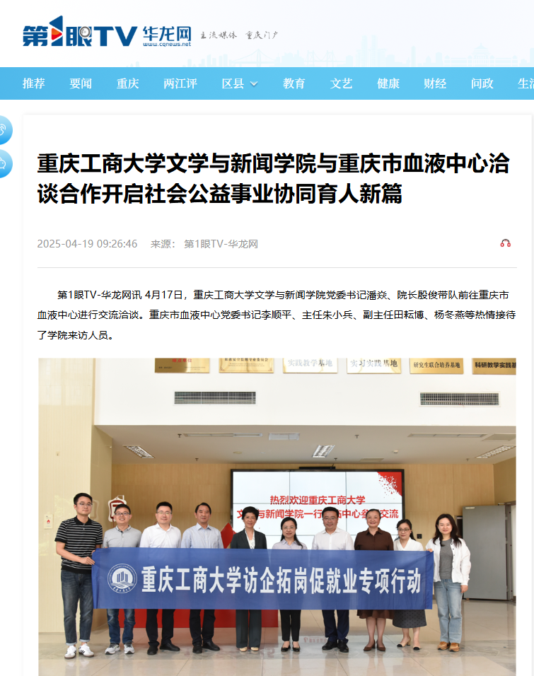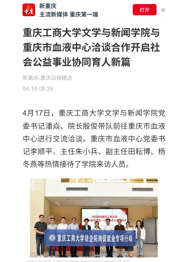 新重庆—重庆日报、第一眼TV-华龙网等媒体以《万象城娱乐awc线路文学与新闻学院与重庆市血液中心洽谈合作开启社会公益事业协同育人新篇》为题对此次活动进行了报道。