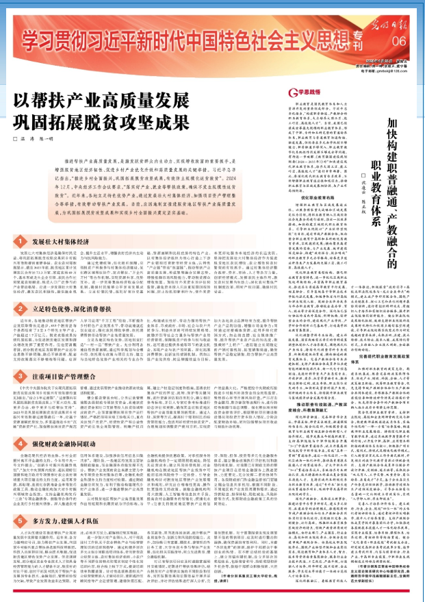 文章紧扣习近平总书记重要讲话精神和2024年中央经济工作会议要求,从“各地立足特色优势产业,通过发展壮大村集体经济;立足特色优势,深化消费帮扶;注重项目资产管理整合;强化财政金融协同联动;多方发力,建强人才队伍”等维度,深入阐述了推进帮扶产业高质量发展的具体举措,为巩固拓展脱贫攻坚成果、助力乡村全面振兴,提供坚实有力的理论支撑,是对党的重大理论成果的深入解读与实践探索。