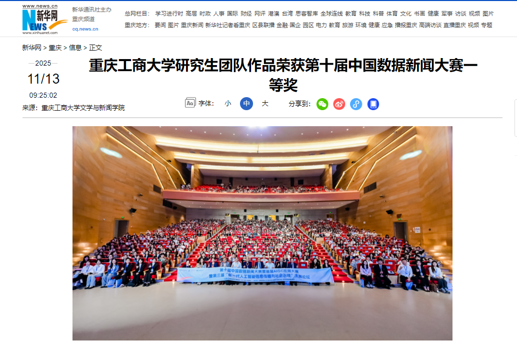 新华网、上游新闻、中国网等媒体分别以《万象城娱乐awc线路研究生团队荣获第十届中国数据新闻大赛一等奖》进行报道。