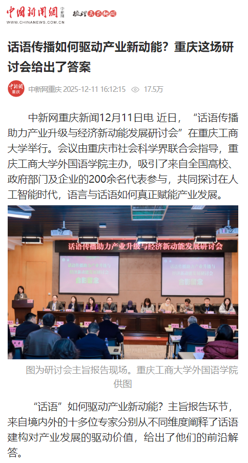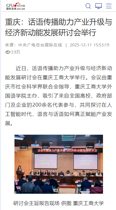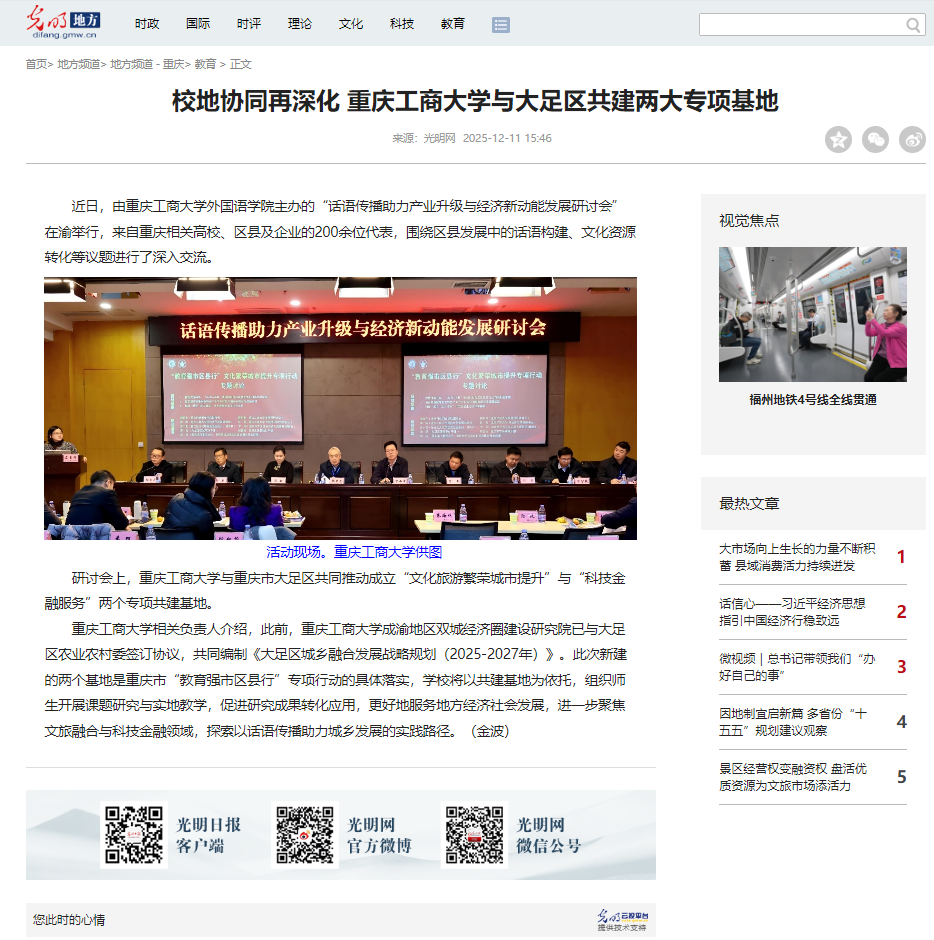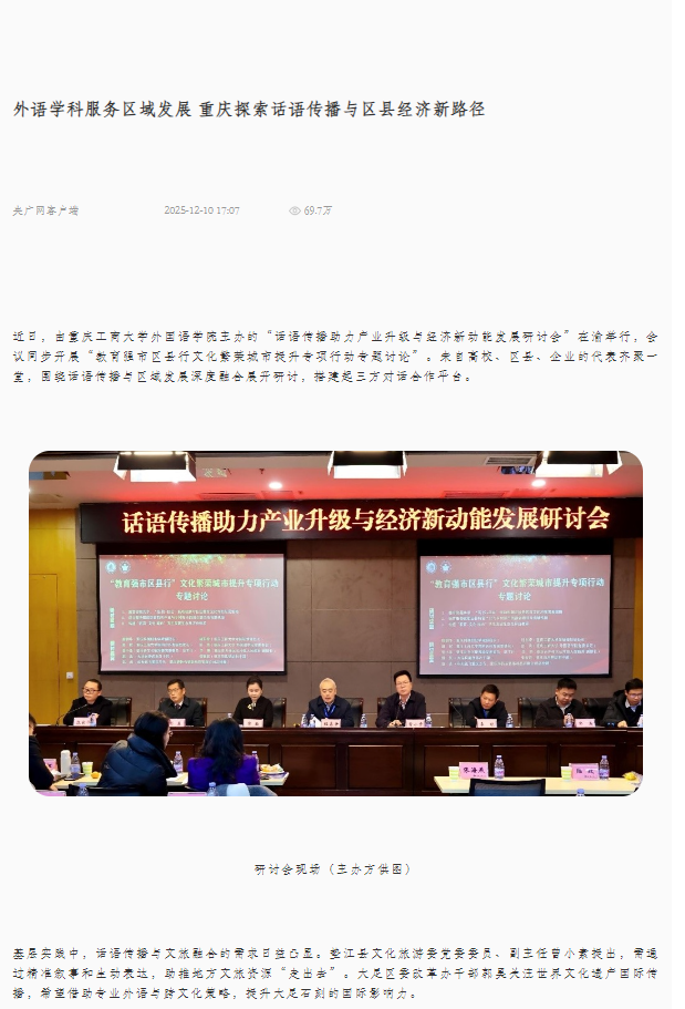 光明网以“校地协同再深化 万象城娱乐awc线路与大足区共建两大专项基地”为题,央广网以“外语学科服务区域发展 重庆探索话语传播与区县经济新路径”为题,中央广电总台国际在线以“重庆:话语传播助力产业升级与经济新动能发展研讨会举行”为题,中国新闻网以“话语传播如何驱动产业新动能?重庆这场研讨会给出了答案”为题纷纷关注报道。截至目前,相关报道的阅读量已超过91.1万人次。