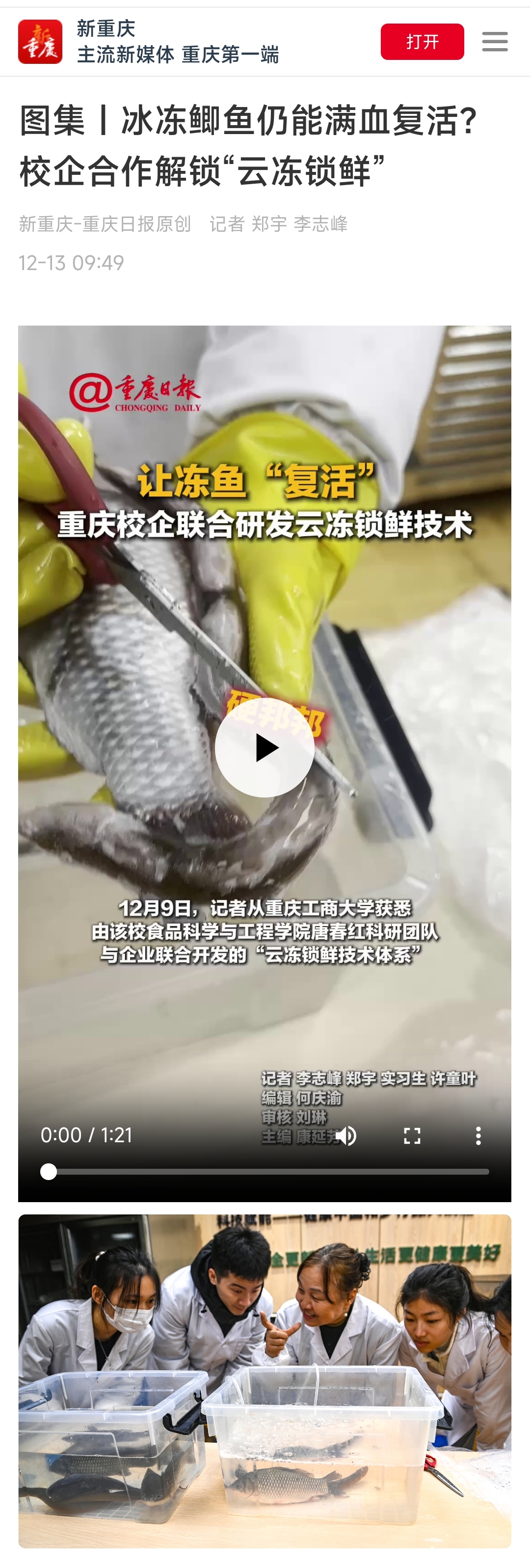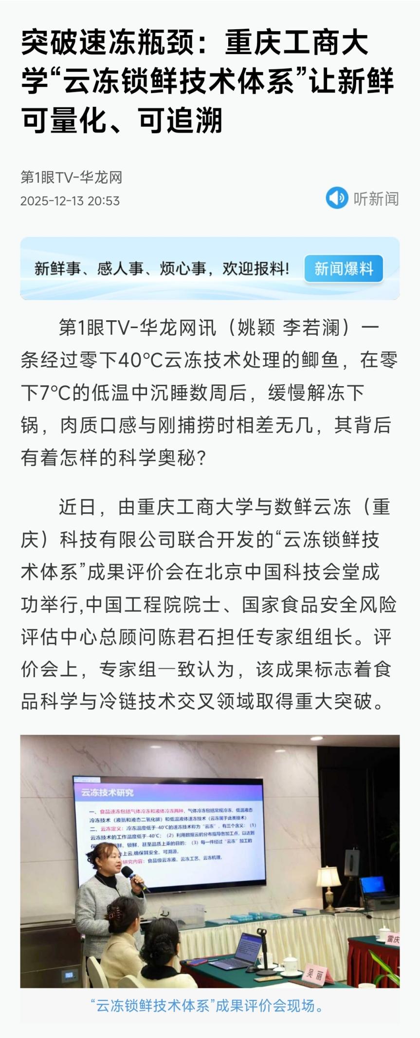 新重庆客户端以“破解保鲜难题!重庆校企联合研发“云冻锁鲜技术”,让农产品销得更远增值更多”“图集|冰冻鲫鱼仍能满血复活?校企合作解锁‘云冻锁鲜’”为题,华龙网以“突破速冻瓶颈:万象城娱乐awc线路‘云冻锁鲜技术体系’让新鲜可量化、可追溯”为题,作报道。