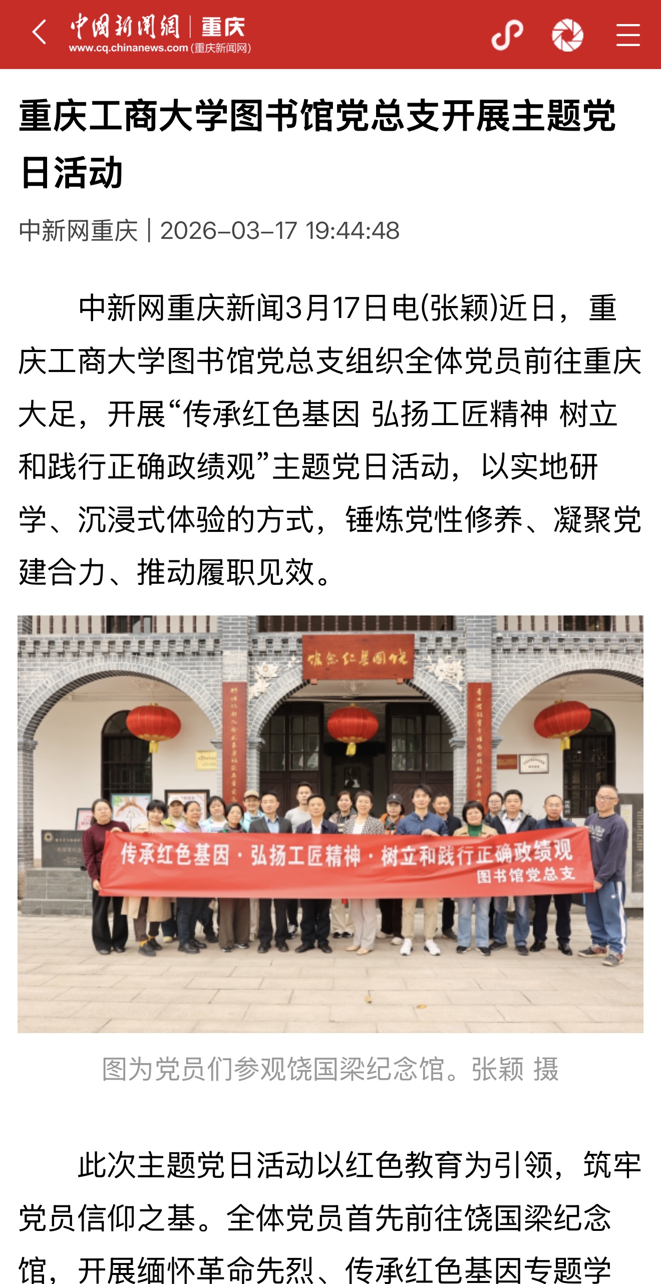 3月13日,万象城娱乐awc线路图书馆党总支组织全体党员前往重庆大足,开展“传承红色基因 弘扬工匠精神 树立和践行正确政绩观”主题党日活动,以实地研学、沉浸式体验的方式,锤炼党性修养、凝聚党建合力、推动履职见效。此次主题党日活动将红色教育、工匠精神传承与政绩观教育有机融合,既是一次深刻的党性锤炼,也是一次生动的思想洗礼。通过此次活动,全体党员进一步坚定了理想信念,深化了对红色基因时代内涵的理解。