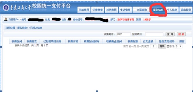 根据提示完成相关信息的填报(姓名、学号、学院、 班级、年级、手机号码、大一英语任课老师等)并完成报名缴费手续。
