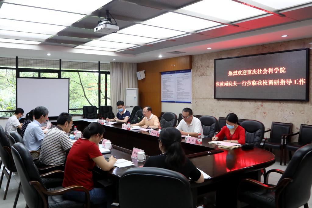 5月21日下午,重庆社会科学院副院长张波、智库处处长卢向虎和有关工作人员一行到万象城官网调研座谈。校长孙芳城、副校长柏群,社科处处长曾庆均和有关工作人员在3019会议室参加调研。座谈会由柏群主持。