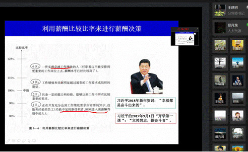 接着,郑月龙老师开展本次教学内容——薪酬结构设计,包括薪酬结构确定的流程和薪酬结构的内涵及关键性指标两个知识点。郑老师精心设计教学环节,采用多种教学方法,充分调动了学生学习的积极性、主动性。在教学中,郑老师首先回顾了与本次课内容相关的前续课程知识,薪酬体系设计基础和薪酬水平及外部竞争性;接着,对薪酬结构确定中的重点知识点内部一致性和外部竞争性,通过数据分析进行形象风趣的讲解,并结合马克思主义政治经济学,简单阐述了我国作为社会主义国家按劳分配与按要素分配有机结合的客观性。据此,郑老师着重指出以按劳分配和按要素分配为指导,具体到组织管理中就体现为按贡献分配,这是薪酬结构设计保证内部一致性的重要理论遵循;进一步地,郑老师在讲述薪酬结构关键性指标,如薪酬区间变动率、薪酬比较比率等,强调按贡献分配在其中的贯彻和体现,并结合习近平总书记2018年新年贺词“幸福都是奋斗出来的”、2019年9月1日开学第一课“立鸿鹄志,做奋斗者”的思想内涵,从人力资源管理学科知识融合的视角,借助《管理学》《积极心理学》《劳动经济学》等课程内容,指出薪酬结构设计作为一项管理活动,应该能够营造一种良好的氛围,让员工能够在这种氛围下“幸福的奋斗”,这是管理者的责任和使命,也是贯彻习近平总书记谆谆教诲的体现。郑老师在讲到知识点“同一组织相邻两个薪酬等级之间的交叉与重叠关系”时,针对知识点“在实践中,大多数情况下,企业倾向于将薪酬结构设计成有交叉重叠的,尤其是中层以下的职位”,与学生进行了“问-答-分析”式的互动,如线下教学那样自如。整节课下来,郑老师的课堂知识点突出、讲解通俗易懂、思政与专业知识融合到位、课堂活跃,保证了线上与线下教学质量和教学效果的同质。
