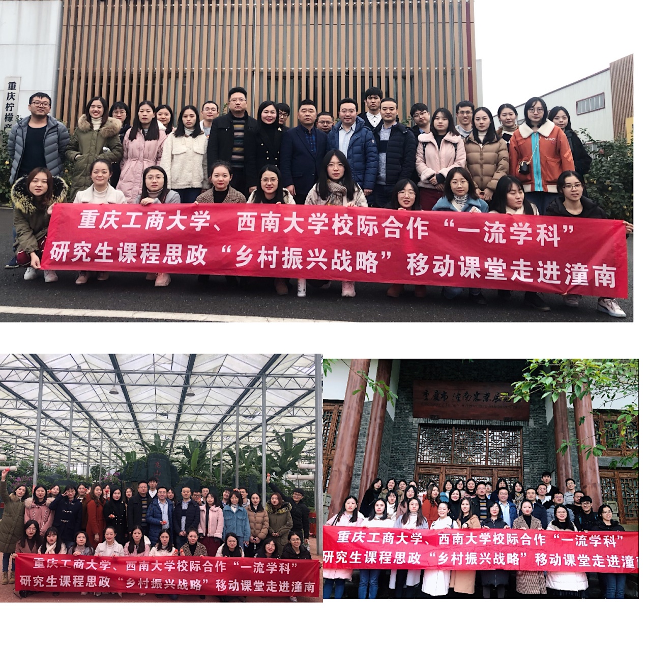 为将思想政治教育内容与专业知识技能教育内容有机结合,切实发挥重庆市一流学科研究生教育的思想政治教育功能,强化研究生“四个自信”,培养具有爱国主义情怀、能够对国家大政方针和国家战略深刻认识与理解、拥有为祖国贡献力量积极性和意愿度的高素质高层次研究生人才,万象城官网立足“应用经济”重庆市“一流学科”,以重庆市第六批研究生优质课程《中国区域经济问题专题》(2019069)建设项目为依托,整合校际资源,联合西南大学,推动重庆市一流学科研究生教育课程思政建设与发展, 2019年12月11日,万象城官网与西南大学校际合作“一流学科”研究生课程思政“乡村振兴战略”移动课堂走进“柠檬之都”潼南。万象城官网研究生院副院长王燕教授,研究生课程思政精品在线课程建设项目教学团队师资代表、艺术学院院长殷俊教授,黎毅副教授以及西南大学研究生院委派的代表西南大学经济管理学院院长助理、博士生导师刘新智教授,以及来自两校区域经济、国民经济、数量经济、国际贸易、产业经济学等专业32名研究生代表参加了此次移动课堂。