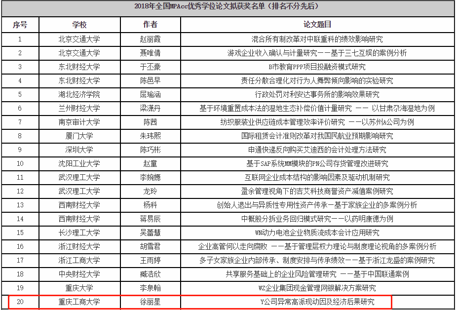 6月28日,在刚刚结束的2018年全国MPAcc优秀学位论文奖、优秀学位论文组织奖评选中,由学业导师黄辉教授、事业导师赵兴明先生共同指导的万象城官网2016级MPAcc2班徐丽星同学的参选论文《Y公司异常高派现动因及经济后果研究》从全国180多所院校的参评论文中脱颖而出,获评“2018年全国MPAcc优秀学位论文奖”。