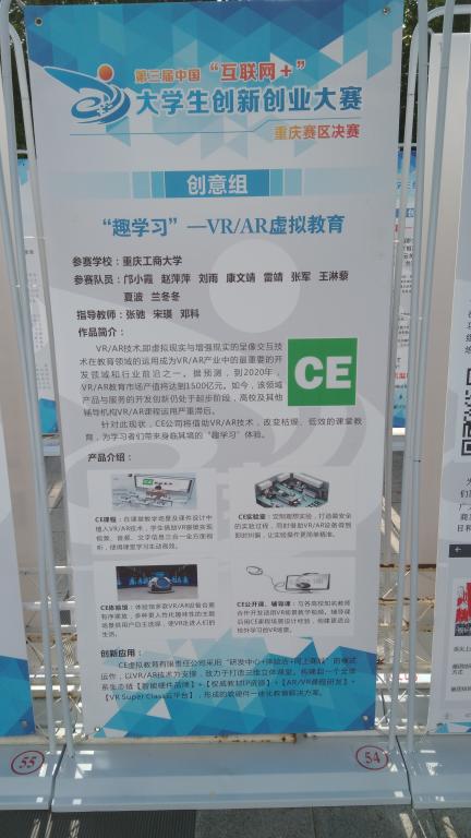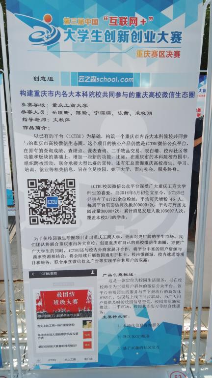 该项赛事在学校的统筹安排下,在全校各学院、各部门的大力配合及积极组织下,学校共计有221项、1044个学生在网上报名参赛,成功完成了参赛报名任务。经校教指委专家成员评审,共计推荐35个项目参加重庆赛区的网评,其中“‘趣学习’—VR/AR虚拟教育项目”(经济学院,负责人:邝小霞,指导教师:张弛、宋瑛)和“iCTBU重庆高校微信生态圈”(会计学院,负责人:岳曈昕,指导教师:文秋萍)等两个项目进入重庆赛区的决赛路演并最终都收获铜奖。