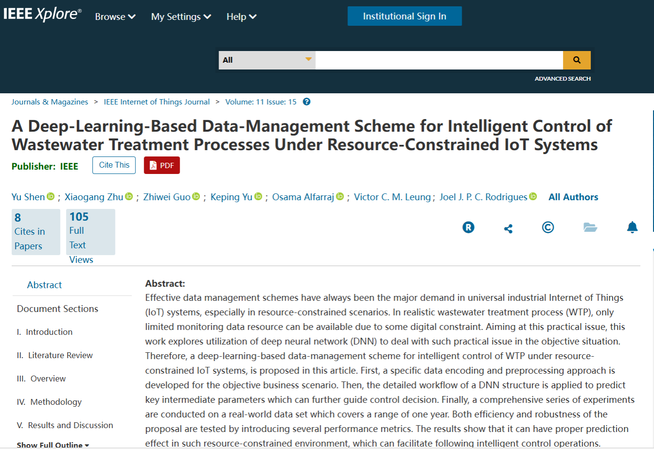 研究成果一:论文《基于深度学习的资源受限物联网系统下污水处理过程智能控制数据管理方法》