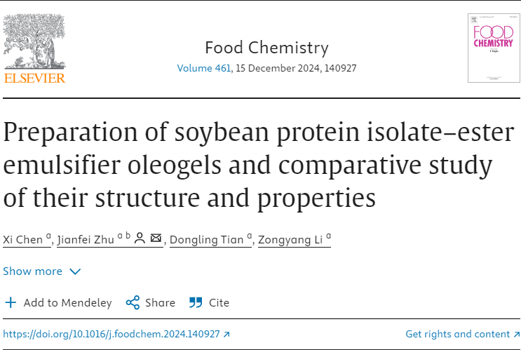 近日,万象城官网食品科学与工程学院2022级食品科学专业硕士研究生陈爔,在导师朱建飞副教授的指导下,在食品领域国际期刊《Food Chemistry》发表了题为“Preparation of soybean protein isolate–ester emulsifier oleogels and comparative study of their structure and properties”(大豆分离蛋白-酯类乳化剂油凝胶的制备及其结构与性质比较研究)的研究论文。