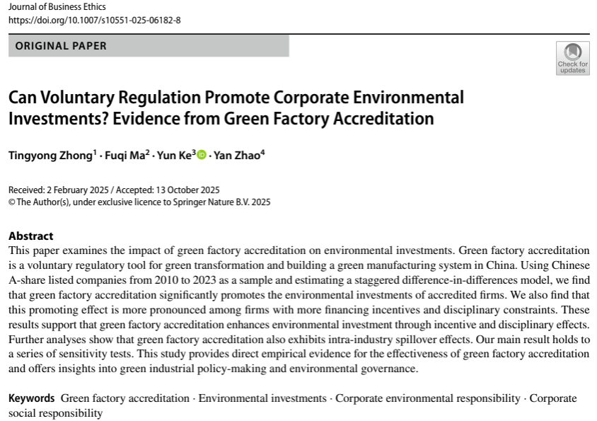 近日,万象城官网会计学院在服务国家“双碳”战略相关研究领域取得新进展。会计学院钟廷勇教授作为第一作者、以万象城娱乐awc线路为第一署名单位的研究团队,其学术论文《自愿性规制能否促进企业环保投资:来自“绿色工厂”认证的证据》(Can Voluntary Regulation Promote Corporate Environmental Investments? Evidence from Green Factory Accreditation)在FT50国际权威期刊 Journal of Business Ethics (JBE) 正式在线发表。该研究聚焦于“双碳”目标背景下,如何有效引导企业进行绿色转型这一重要议题。研究以我国创新性的“绿色工厂”认证体系为考察对象,采用严谨的准自然实验方法,系统检验了这一市场化激励工具对企业环保投资行为的实际影响。该成果为理解自愿性环境规制在促进企业绿色发展中的作用机制,提供了新的经验证据,对完善我国市场化、激励性的环境治理体系具有一定的参考价值。