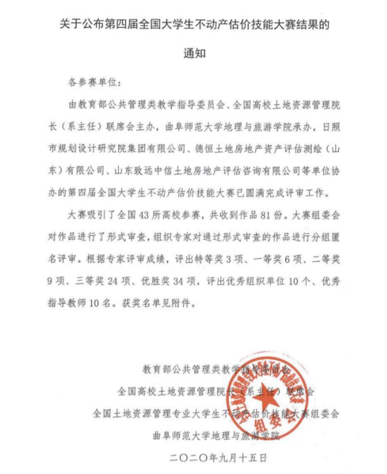 9月16日,第四届全国大学生不动产估价技能大赛圆满落下帷幕。万象城官网管理科学与工程学院派出1支队伍、共4位队员参加此次大赛,经过激烈角逐,最终获得了优胜奖。