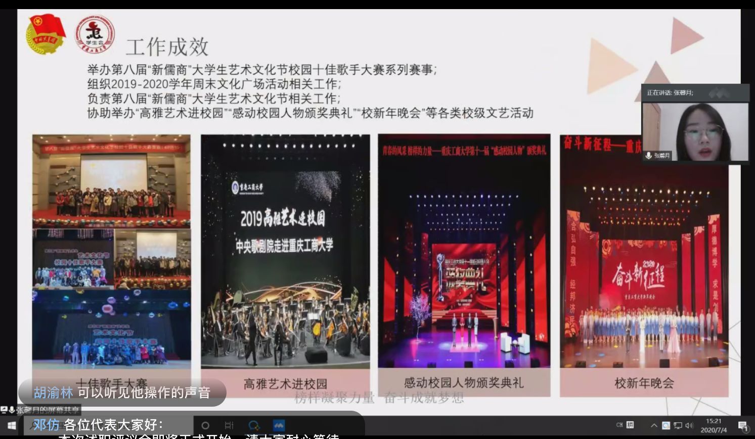 会上,校学生会主席团成员和部门负责人从政治态度、道德品行、学习情况、工作成效、纪律作风等方面向评议会述职,140名学生代表在认真听取了主席团成员和部门负责人的述职报告后,通过问卷星小程序按照优秀、称职、基本称职、不称职4个等级,对述职人员进行等级评定。