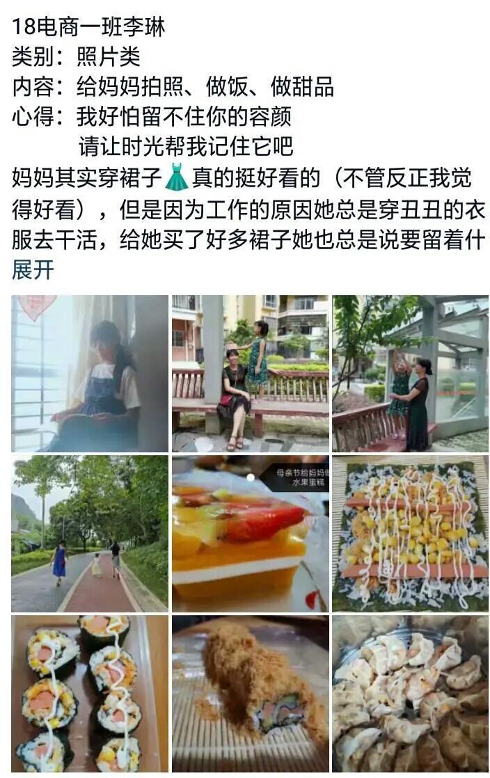 18级国营二班的杜颖嘉同学借此次机会给妈妈化妆,并且晒出了妈妈美美的妆以及合拍;18级电商一班的李琳同学选择了给妈妈拍照、做饭、做甜点,一份份可口的饭菜,穿着裙子漫步的妈妈,她写道:“我好怕留不住你的容颜,请让时光帮我记住它吧”;18级市营一班的钟艳同学选择了对家里进行一次彻底的大扫除,辛勤劳动过的房间很是干净清爽;17级国营二班的李仁娇同学晒出了一组别具一格的照片,照片中她亲自为母亲和爷爷洗脚,“为了报答爷爷和母亲,缓解劳累,我亲自烧水,为他们洗脚”,她在心得中这样写道。参与此次活动的很多同学主动记录劳动经历,与父母在朋友圈或者空间积极互动,对父母来说,子女能够在家劳动,给予他们真情陪伴,这是最好的礼物。