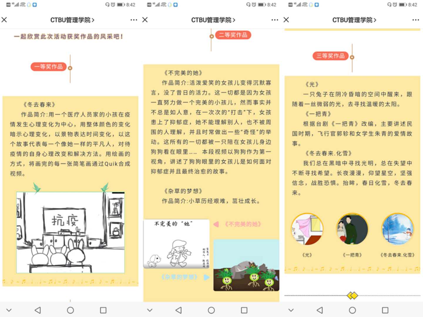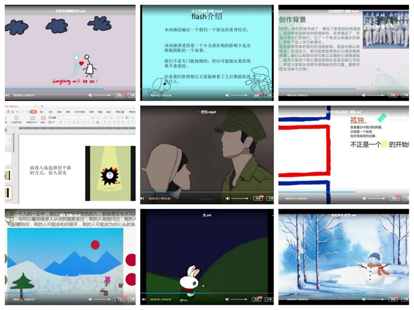 本次心理Flash视频制作活动以“心印暖阳 ‘帧’显阳光”为主题,面向全校学生广泛征集作品,受到了各学院学生的广泛关注,大家纷纷提交精心制作的作品,积极响应参与活动。经过激烈的角逐,《冬去春来》《光》《一把青》等十个稿件脱颖而出,赢得了难能可贵的决赛机会。在整合初赛得分、评委打分及线上投票多个指标过后,作品《冬去春来》最终以77.53的分数夺魁。该作品展示了疫情期间居家生活由冬天到春天的转变,表达了对宅家生活疫情阴霾之下冬日的展望与春天的绽放。作品《不完美的她》《杂草的梦想》分别以75.80、74.33的分数位列第二、第三。作品《光》《一把青》《冬去春来•化雪》获得三等奖。至此,历时1个月的万象城娱乐awc线路第十六届“心印暖阳 “帧”显阳光”心理flash视频制作比赛活动圆满结束。