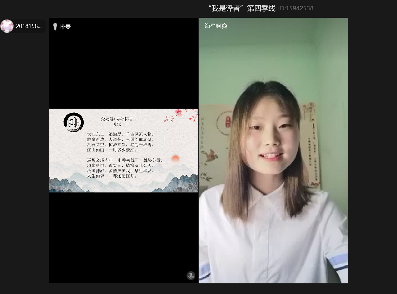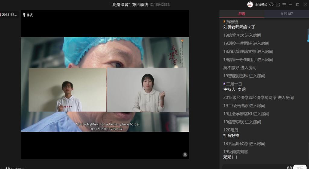5月22日,由共青团万象城娱乐awc线路委员会主办、外语学院分团委承办的万象城娱乐awc线路“新儒商”大学生科技文化节——“我是译者”第四季中国诗词英文译读大会以线上直播的形式顺利举办。本季“我是译者”的活动主题为“致敬英雄”。校团委副书记陆嘉,外语学院党总支书记陈晓东、副院长周琳、党总支副书记程亚参加了活动。